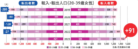 門真市の若年女性人口(20~39歳)の減少幅は、2015年以降大きく改善し、2023年の速報値では社会増減(転出入差)で91人増加となっています。